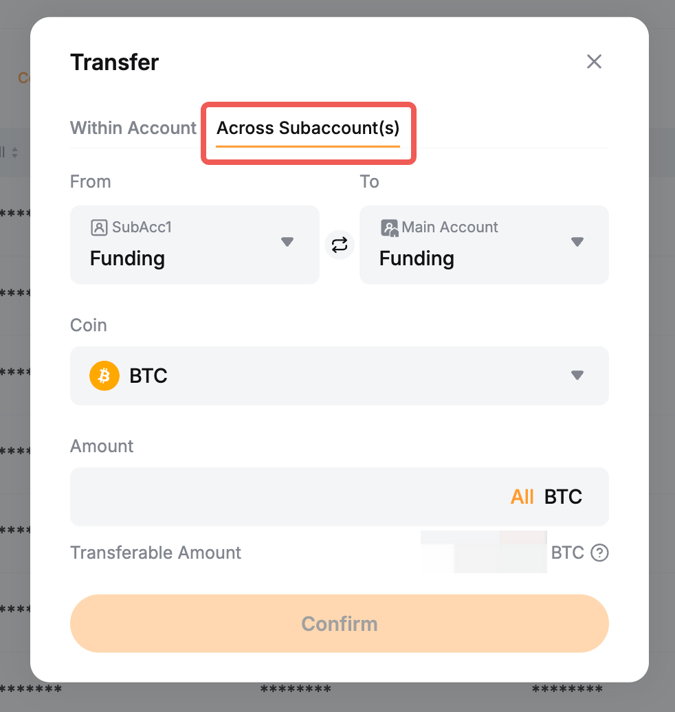 - 如果您想提取子账户中的资产,请点击划转并选择跨子账户选项卡,将资产划转至主账户。
