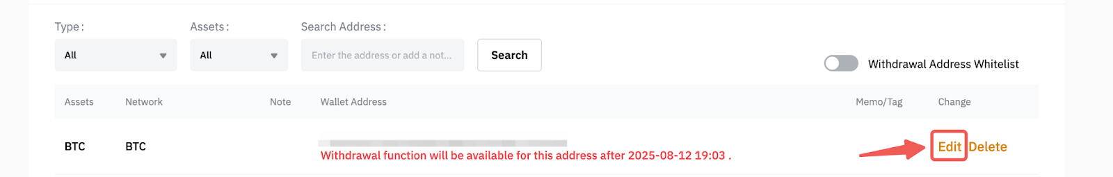 例如,如果您启用了新增地址提币限制安全功能,则新保存地址的提币功能将被限制24 小时,禁用此功能后也会触发24 小时限制。