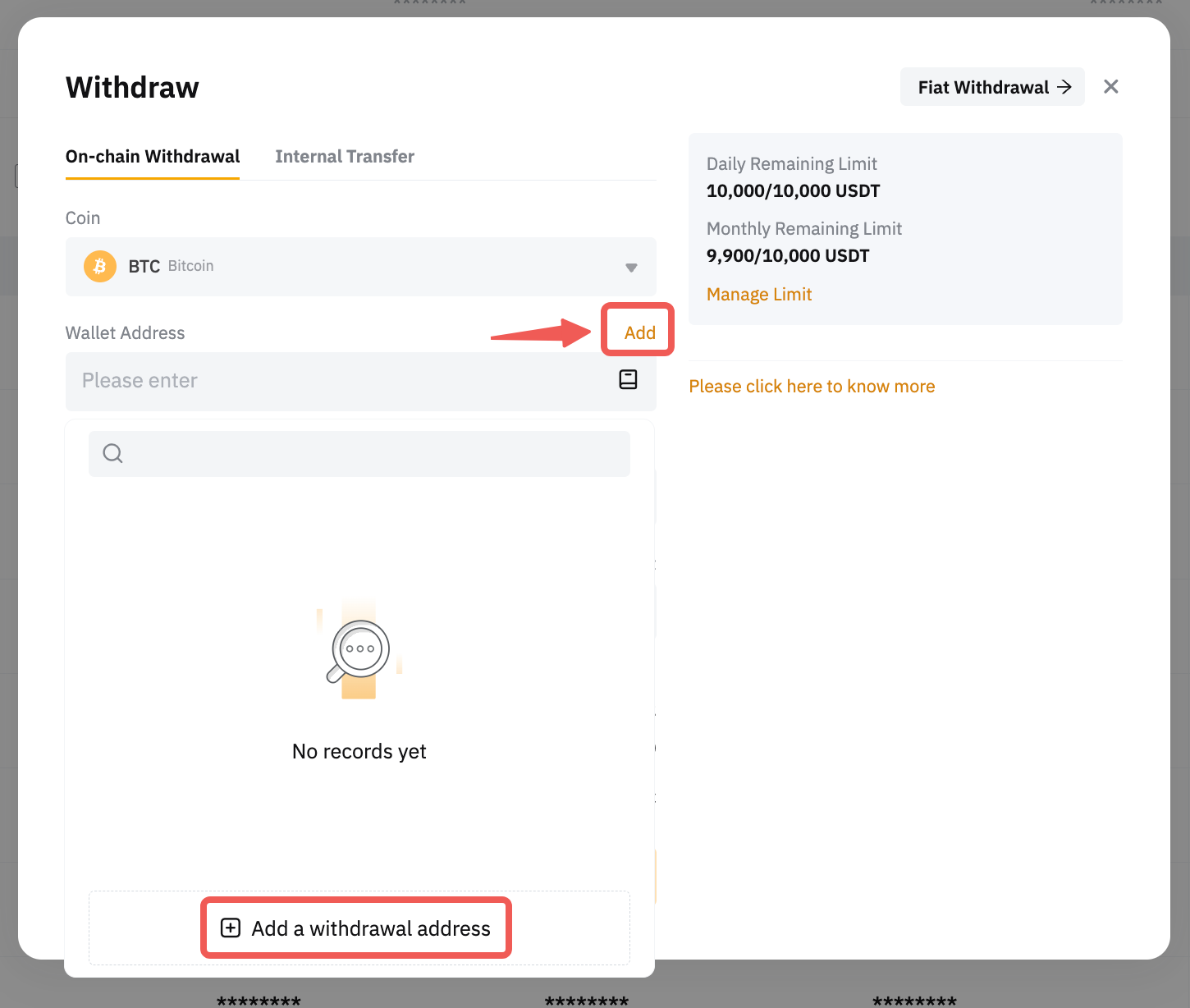 b. 如果您在资金资产页面上,点击提现后,提现窗口将弹出。请点击添加提币地址按钮,跳转至提币地址管理页面
