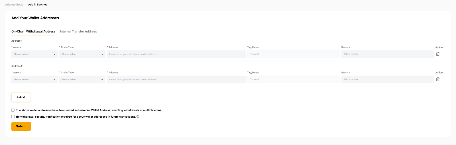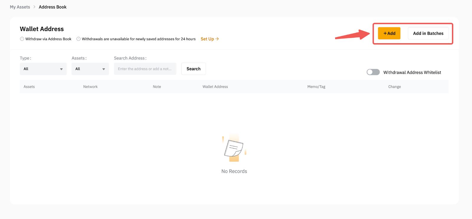 a. 进入提币地址管理页面后,请点击页面右上角的添加按钮添加新钱包地址。如需同时添加多个地址,请点击批量新增地址
