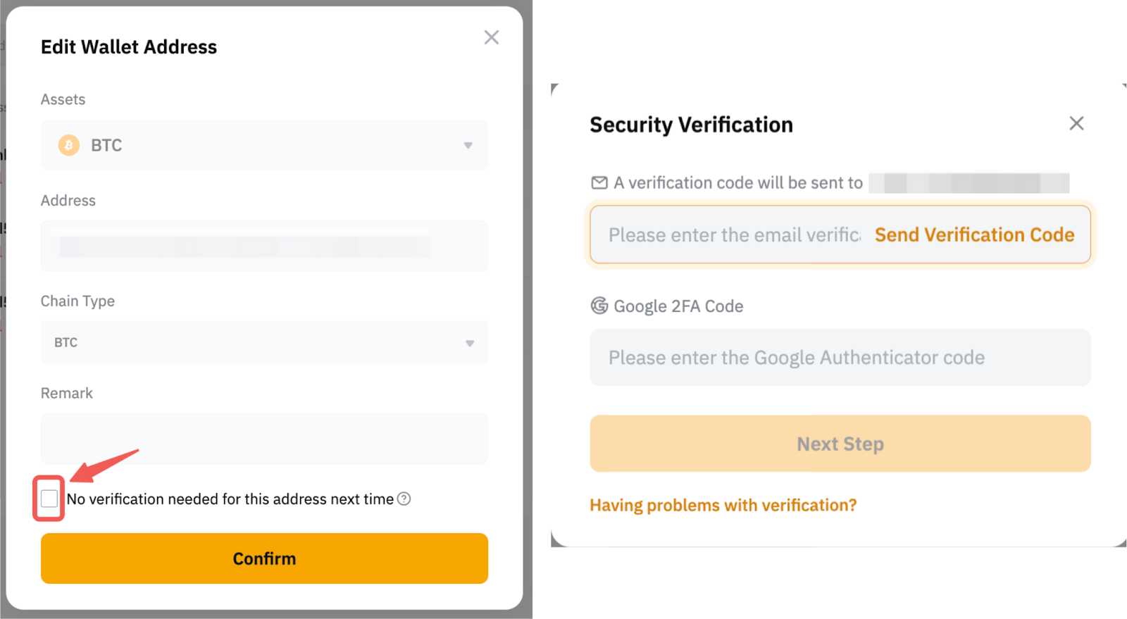 3. 如果要启用另存为通用钱包地址下次不需要验证该地址功能,请选中下面的框。但是,请注意,如果在您的帐户中检测到任何异常活动,也可能需要进行安全验证。