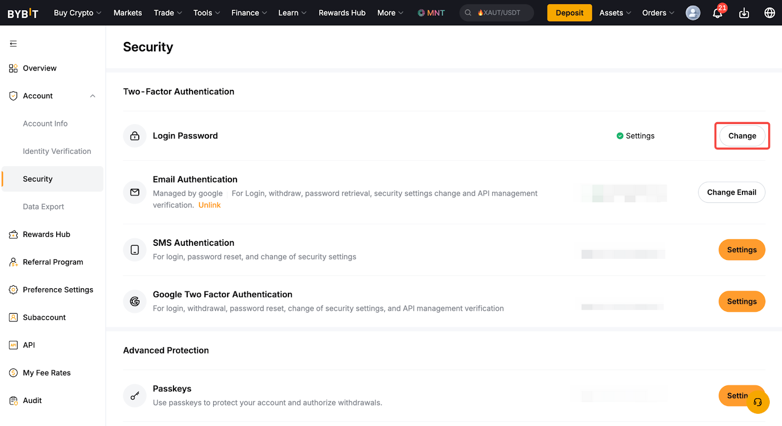但是,如果您最初使用谷歌账户注册 Bybit 账户,则可以直接点击登录页面上的谷歌图标进行登录。然后,点击个人资料图标 → 安全 → 修改密码以重置密码。