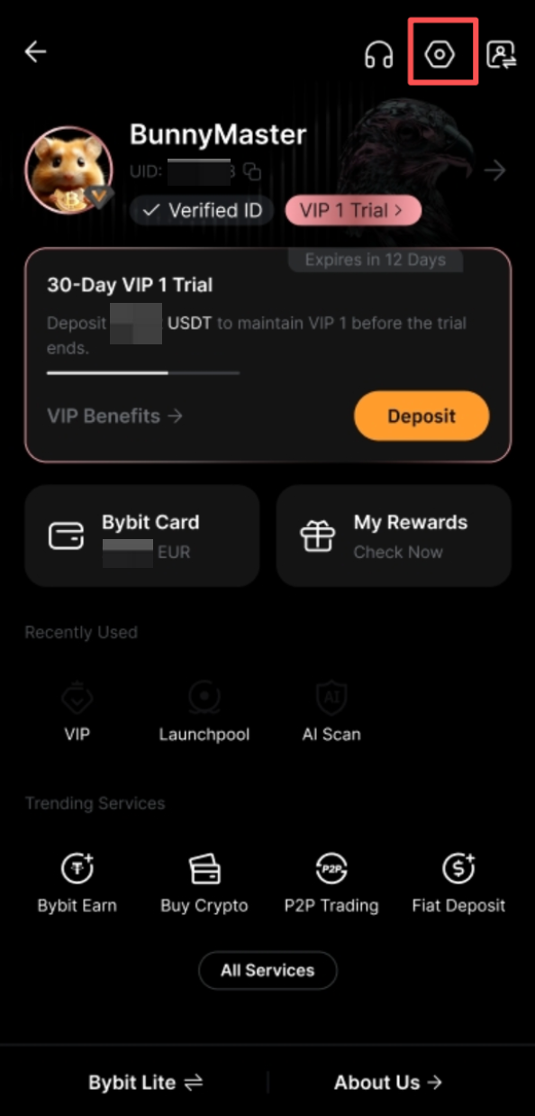 第 1 步:打开 Bybit App,点击左上角的个人资料照片,然后点击 设置 图标以打开 用户中心。
