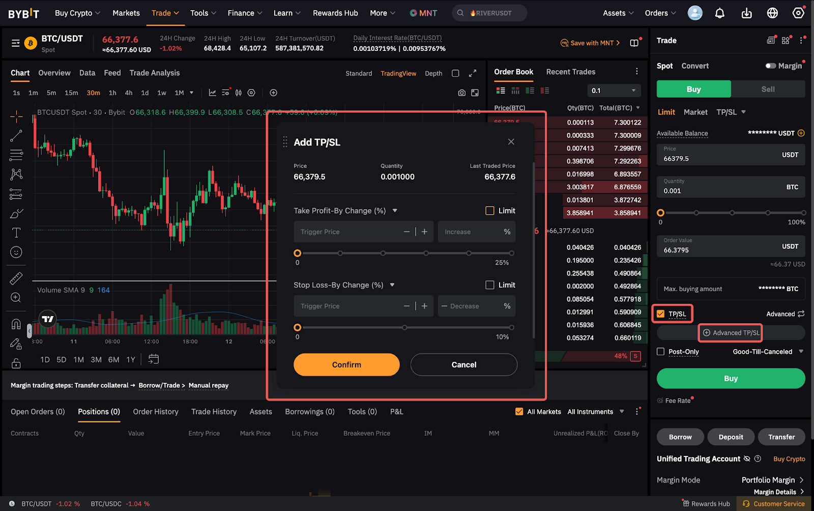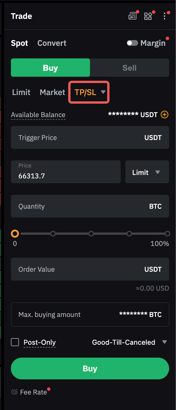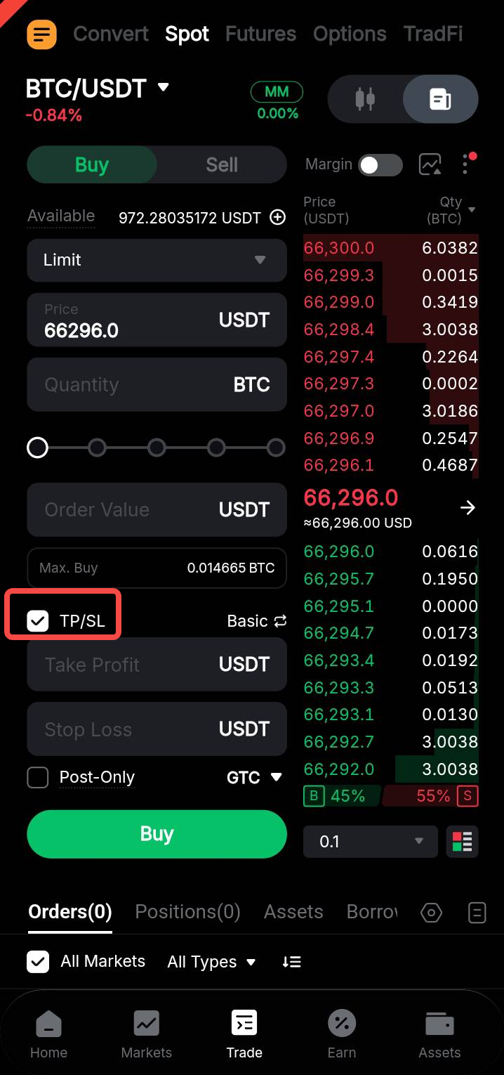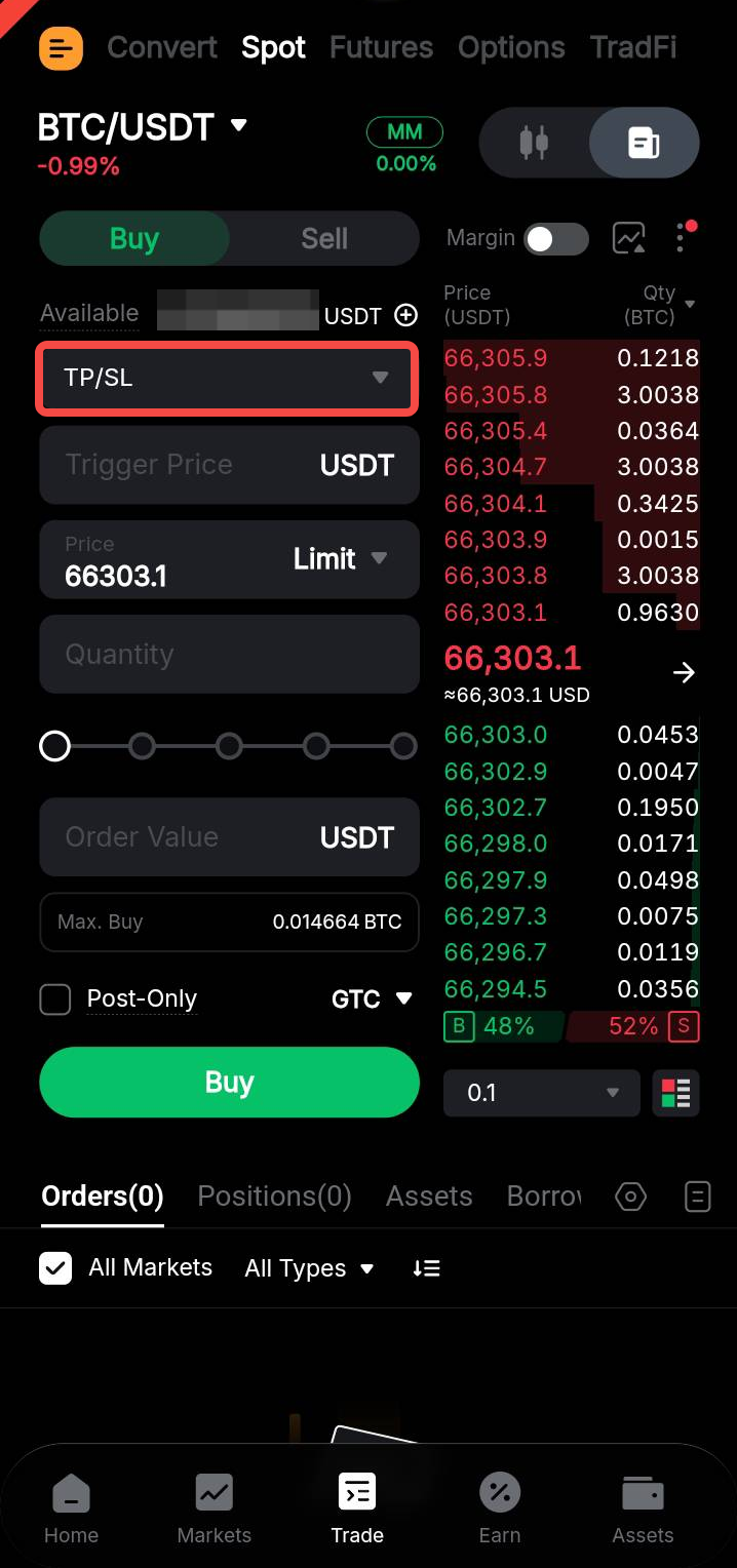 您可以设置止盈/止损订单的触发价格、订单价格(限价单)和订单数量。下达止盈/止损订单时,将会占用资产。一旦最新成交价达到预设的触发价格,就会根据当前的订单参数下达限价单或市价单。