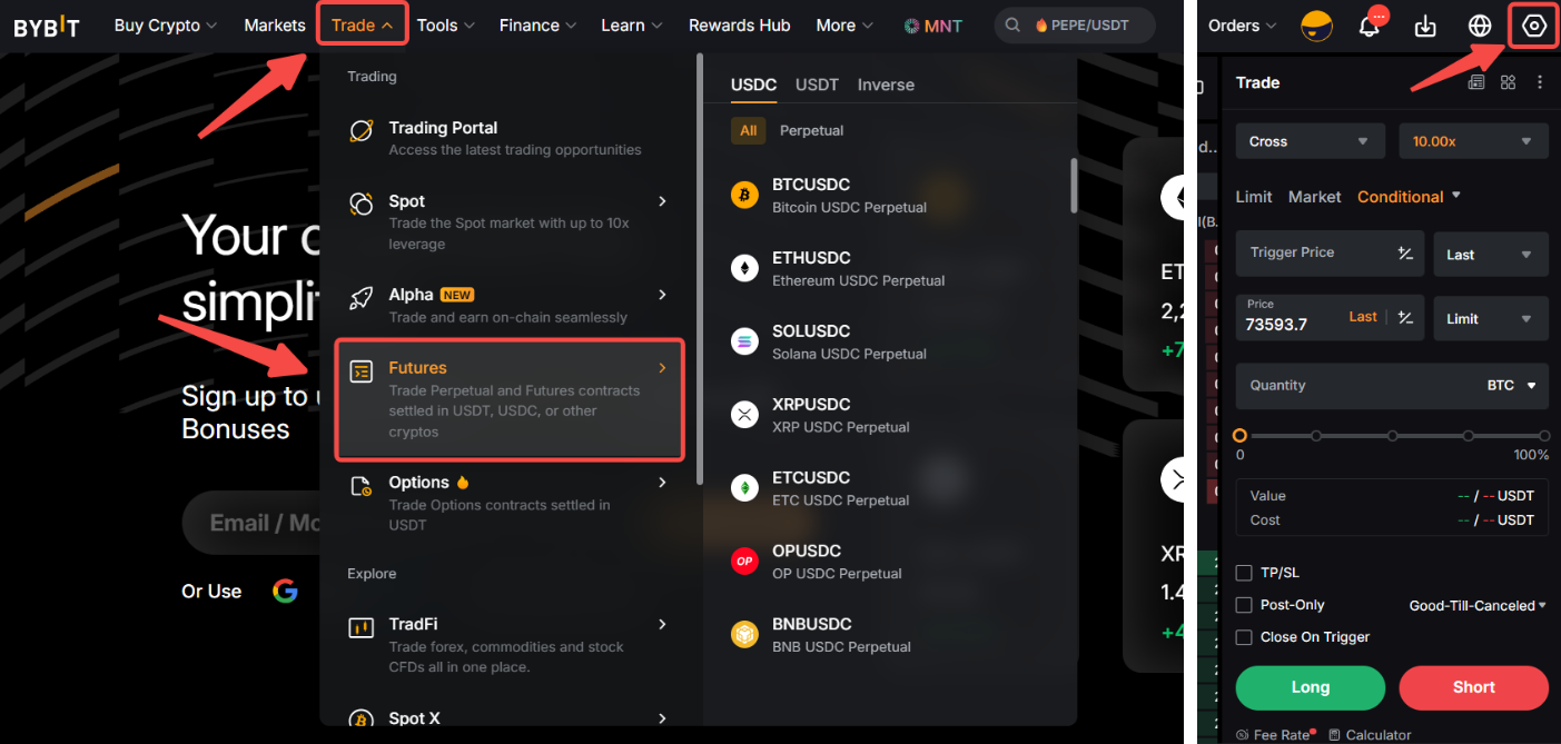 第 1 步:在 Bybit 网站上,前往 交易 → 期货,然后点击右上角的 设置 图标。