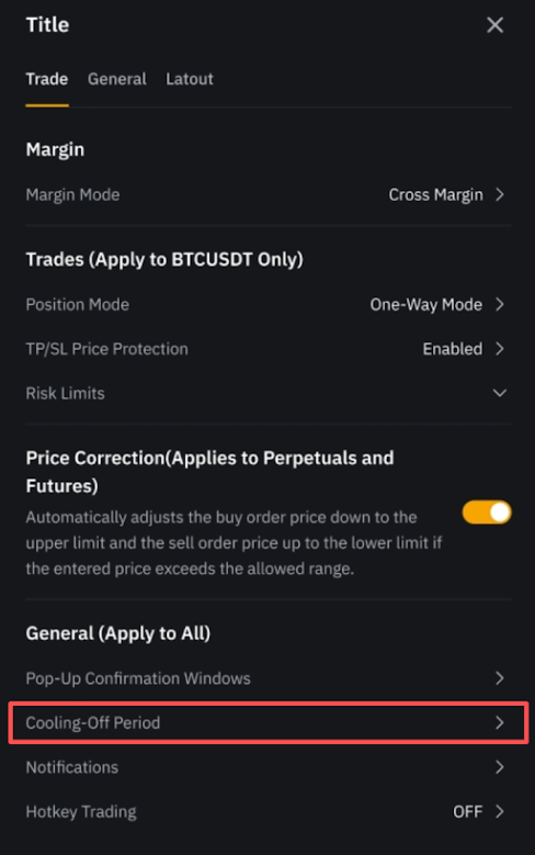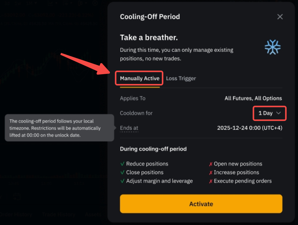 冷静期是一项风险管理功能,您可激活该功能来暂停期货交易。该功能可让您暂时停止交易,重新评估交易策略,避免冲动或情绪化决策。
