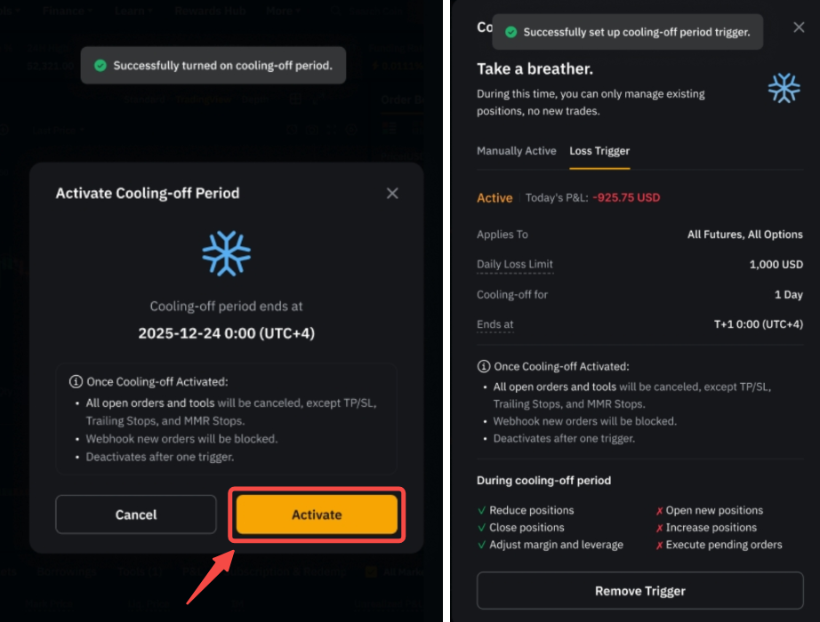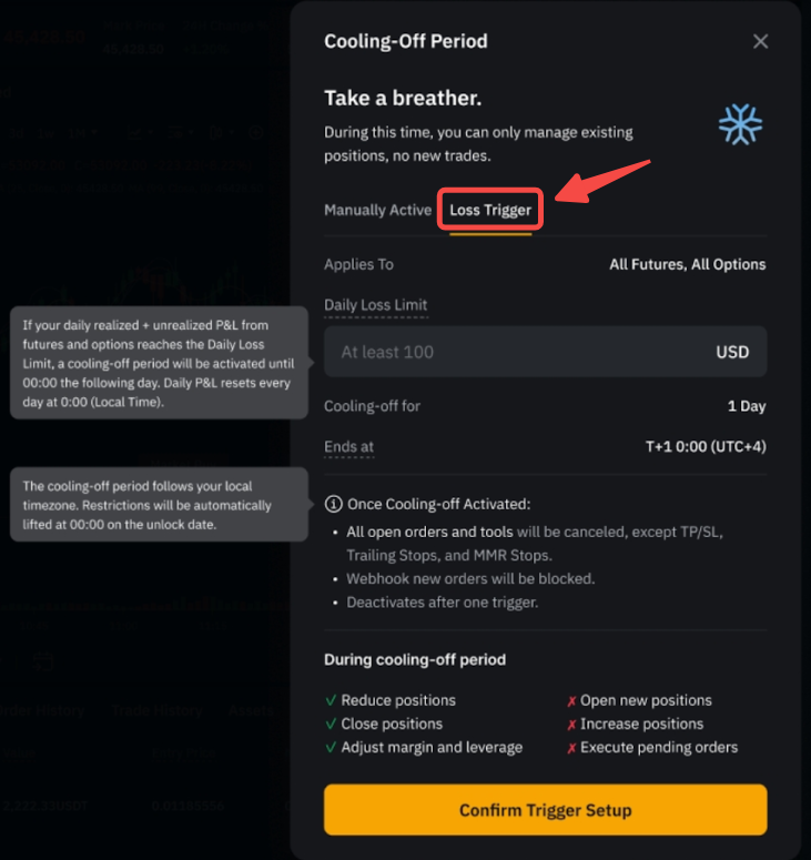 - 一旦激活,冷静期将保持运行中状态,直到后一天凌晨 12 点,之后将自动停用。如需再次使用,您需要设置新的亏损触发。