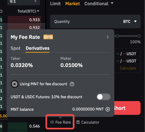 在 Web 交易页面上,单击费率并打开使用 MNT 获取费用折扣选项。