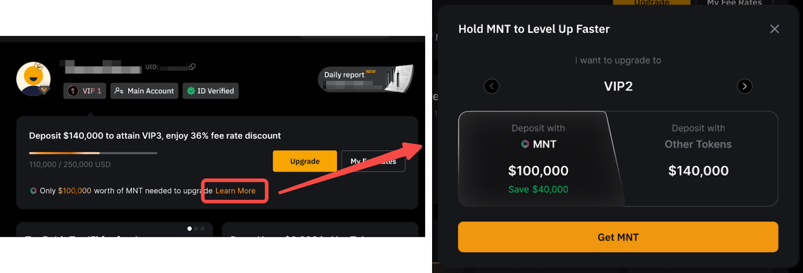 如果您有兴趣了解需要存入多少钱才能升级,您可以点击屏幕右上角的个人资料图片,进入 VIP Me 页面。然后点击“只需充值价值$ {certain amount} 的 MNT 即可升级”旁边的了解更多按钮。