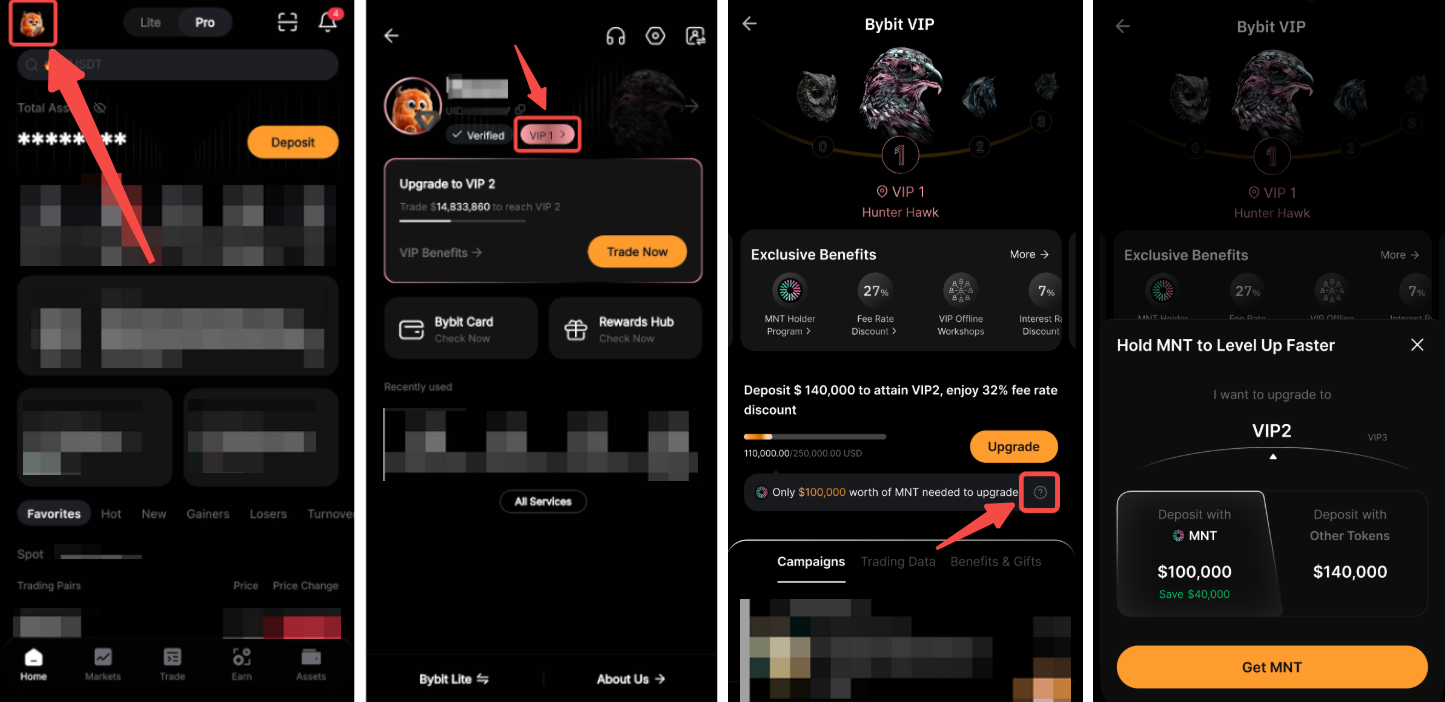如果您正在使用 APP,请点击左上角的个人头像,然后点击您的 VIP 等级。接下来,点击“只需充值价值$ {certain amount} 的 MNT 即可升级”旁边的问号图标,查看升级所需的充值金额。