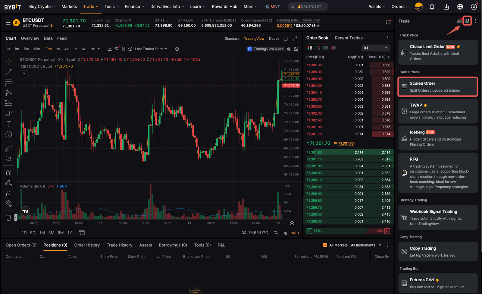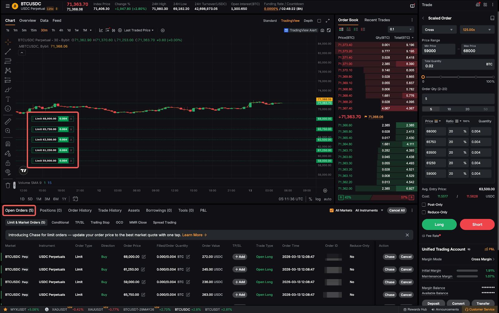 成功提交分段订单后,系统将更新您的图表,体现各个价格的分段订单的状态。您可以从 当前委托 选项卡中查看您已下的限价单。
