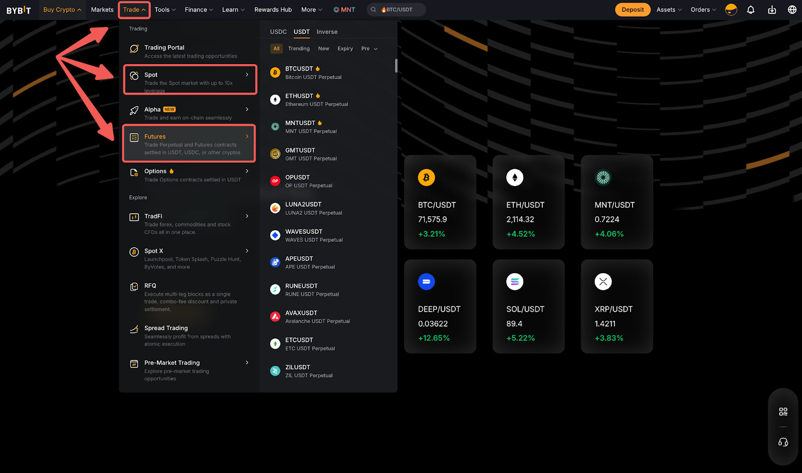 第 1 步:在 Bybit 主页上,前往 交易 下拉菜单,然后选择 现货合约 交易。然后,选择您希望交易的合约。