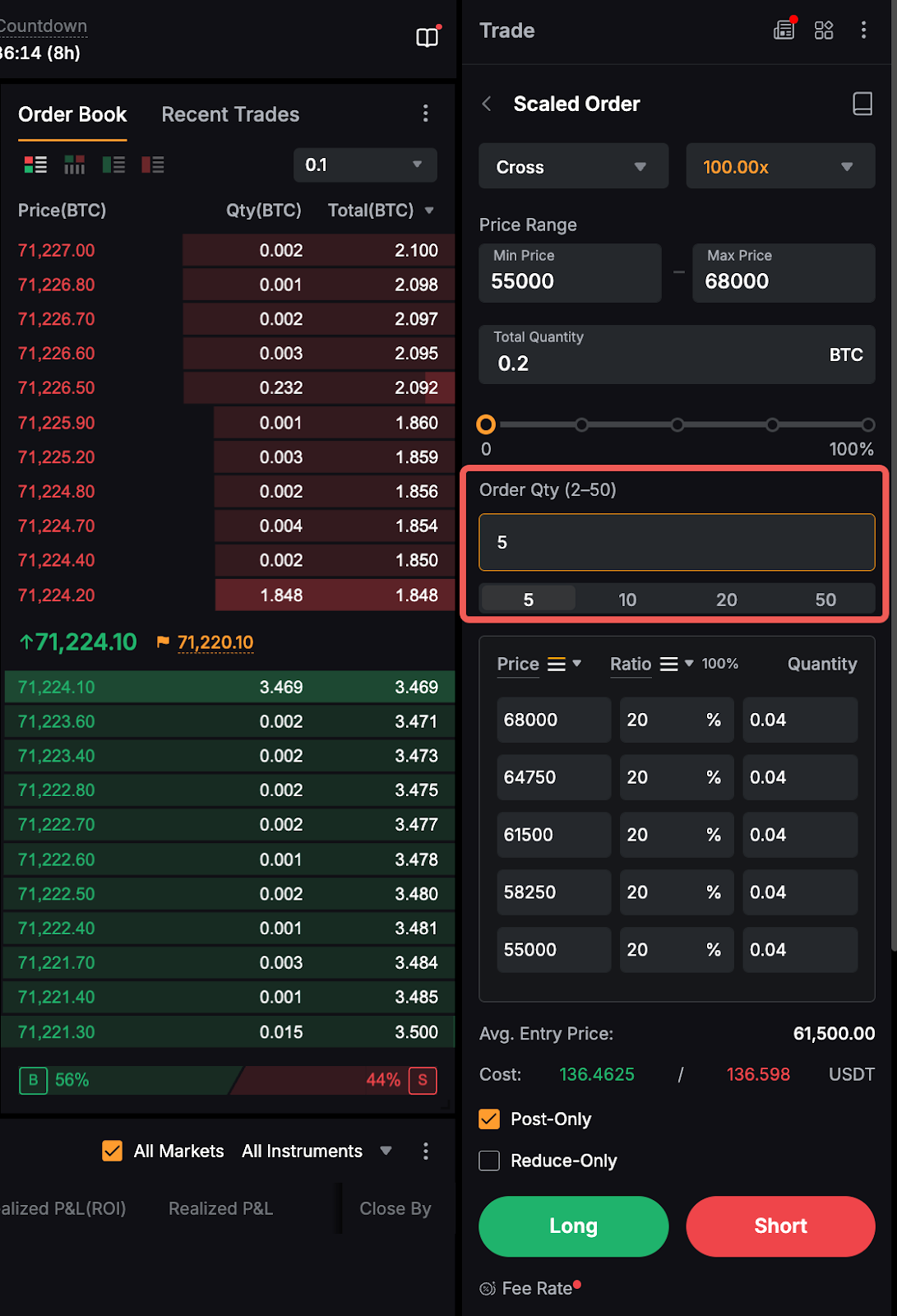 例如,BTCUSDT 的最小和最大订单规模分别为 0.001 BTC 和 100 BTC。因此,分段订单的最小和最大数量则分别为 0.01 BTC 和 1000 BTC。