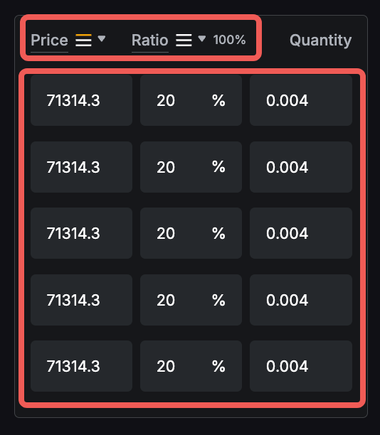 在分段买入中,市价下跌将依次触发低价订单。相反,在分段卖出中,市价上涨将触发高价订单成交。分段订单可用于在开仓或平仓时获得更优均价,或者用于控制订单在特定价格区间内的分配和变化。