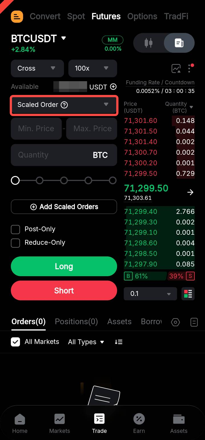 在 App 端,请前往“交易”选项卡。点击订单类型下拉选单,选择“分段订单”,并输入您指定的价格区间(即分段订单的价格上限和下限)以及分段订单的数量