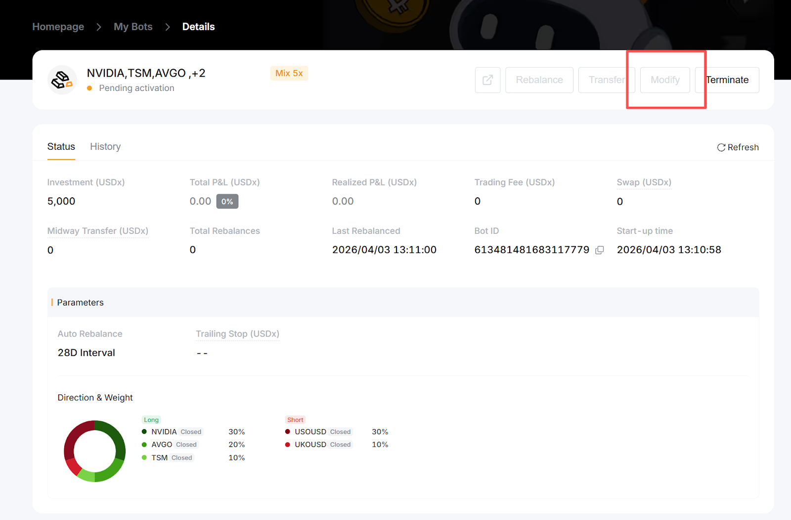 注意: TradFi 網格策略僅支援做多部位,且兩種合約權重均為 50%。