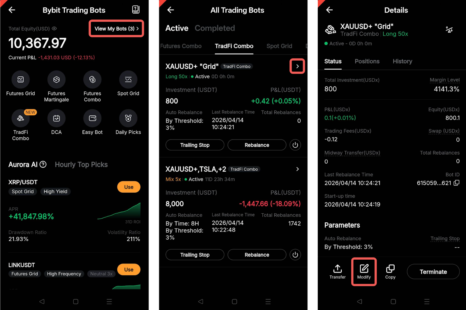 是的,您可以從機器人詳情頁面修改運行中的 TradFi 拼盤機器人參數。在網站上,只需前往我的機器人 → 詳情 → 修改。