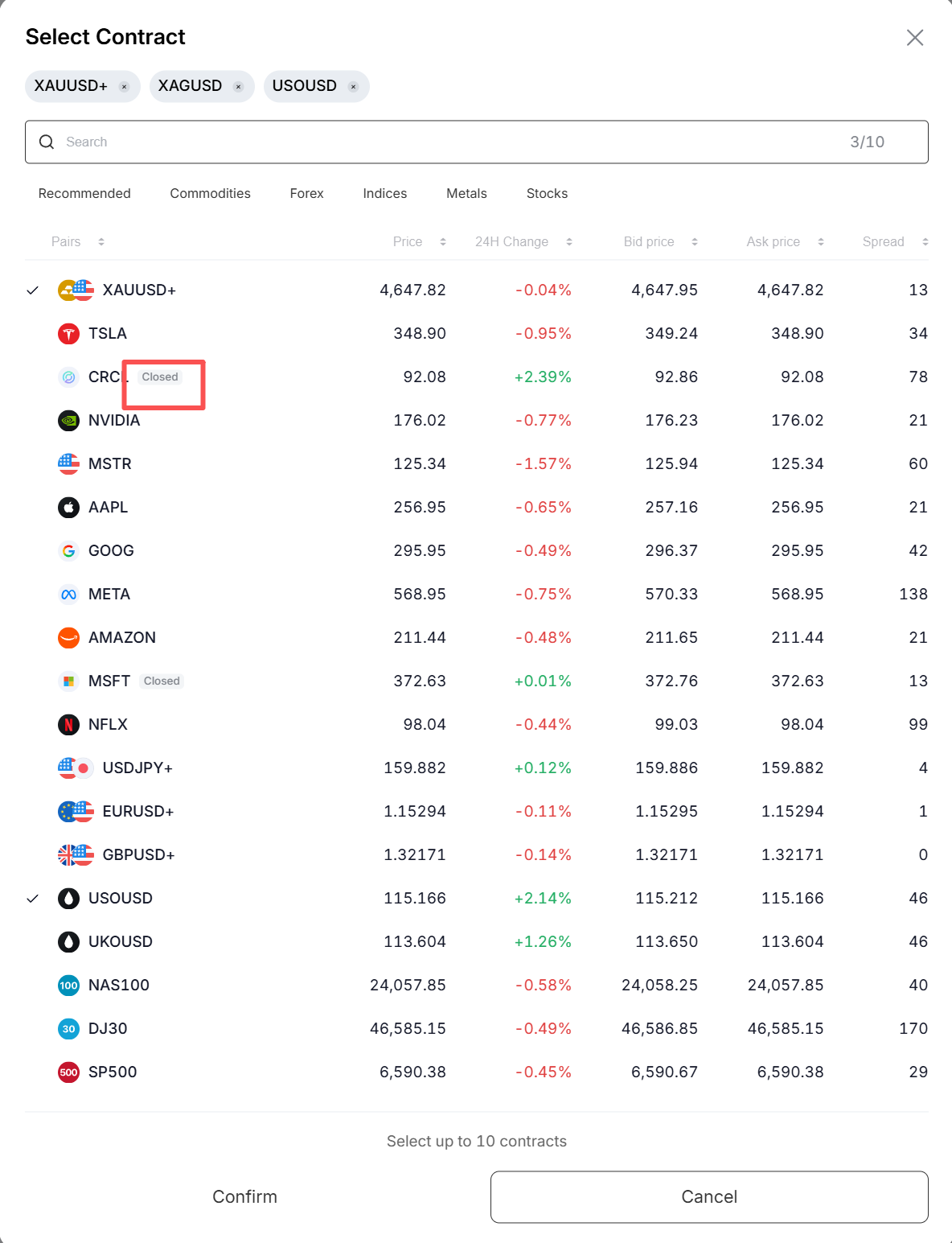 您可以為每個 TradFi 拼盤 機器人選擇 2 到 10 個合約,並根據您的偏好設置自定義其權重。您也可以使用 等權重 選項,一鍵將配置平均分配到所有選定的合約。