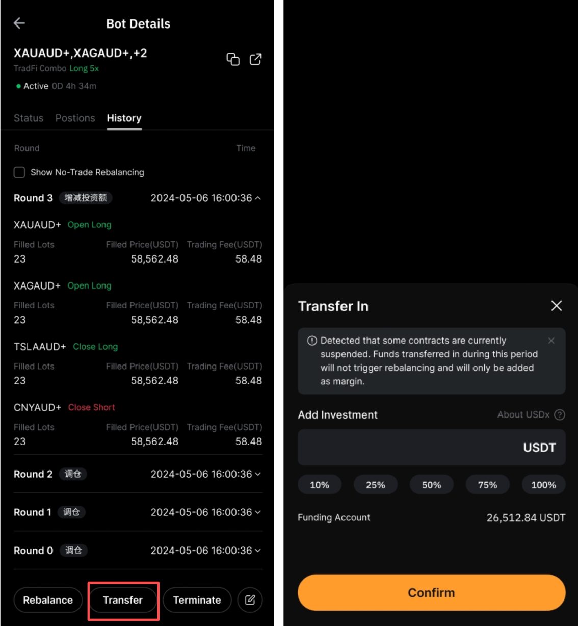 當您創建機器人並輸入您的投資數量時,系統將自動從您的資金賬戶划入資金到機器人,以供立即參與。