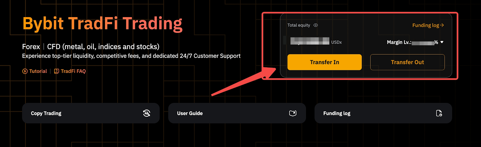 第 2 步:在 Bybit TradFi 交易頁面上,按一下轉入按鈕將資金轉入您的 TradFi 帳戶。